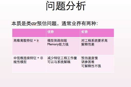另外一个是中低维连续特征加上非线性模型,根据我们的了解,最近阿里也是偏这个方向。这个优点很明显,非线性模型对比 LR 在特征工程上有天然的优势,LR 非常依赖特征工程做得怎么样,但非线性模型这方面稍微好一点。我们自己和引擎做一些解耦,可以通过批量推分数的方式和引擎做解耦,这样线上打分系统的问题就可以部分被解决。但是劣势是预估速度慢,模型确定比较困难,调参困难,因为线性模型人是可以理解他是做什么的,但是非线性模型不知道它在干什么。尤其是现在的深度学习模型,理解起来就是偏黑盒的东西。