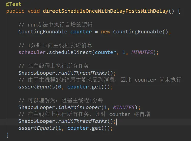 ShadowLooper.runUiThreadTasks()可以模拟主线程执行ShadowLooper.idleMainLooper()可以指定时间来阻塞主线程- 除此之外