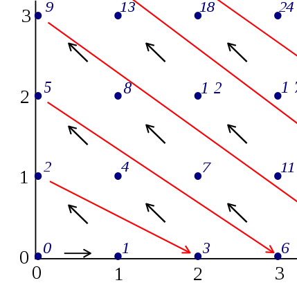 结果没用多久就通过pair function找到了想要的 Pairing Function 里面有列举 N x N => N的映射,并给出了一个实现 Cantor pairing function。这个映射最开始用来证明二维空间和一维具有相同的基数(cardinal number), 面对康托这类神人唯有长跪不起。