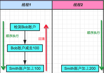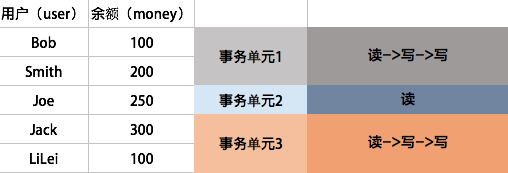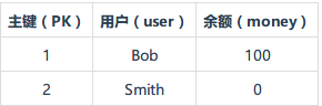 举个栗子,Bob向Smith转账100块这样一个动作,包含多个对数据库的读写操作,我们把这一系列操作成为一个事务,具体操作如下表所示。