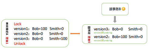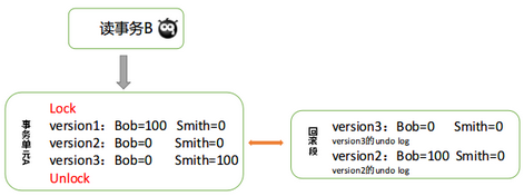 如上示例,事务A正在转账,整个转账的过账中Bob和Smith账户数据有3个版本,其对应回滚段中的数据有两个版本,所以事务B读到的数据始终是初始状态的值,也就是回滚段中version2的数据,其对应的是事务A中version1的数据。