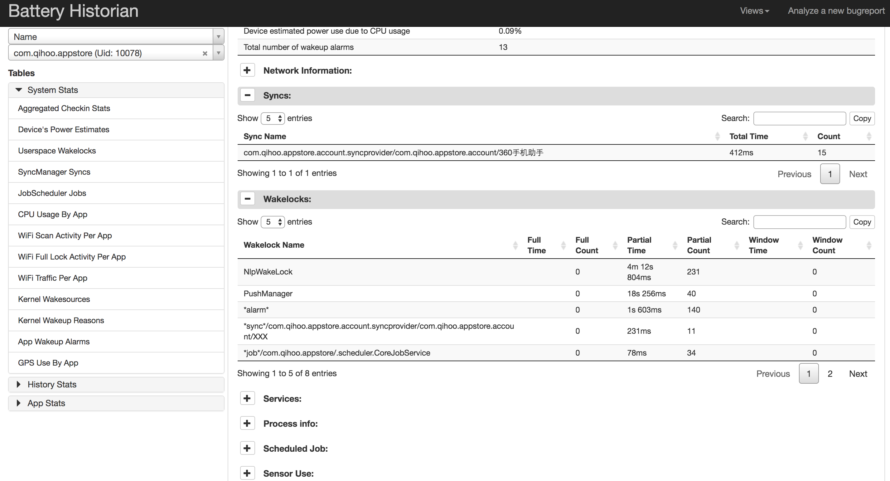 adb bugreport > bugreport.txt(Android7.0以上 adb bugreport bugreport.zip)安装Battery Historian后打开:http: //localhost:9999/, 上传bugreport.txt文件开始分析,下图分析360手机助手为例;