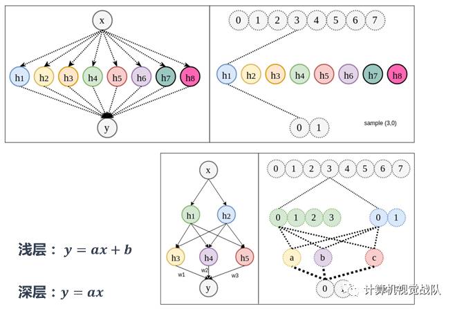 而深层神经网络,由于拆分的变体可以在不同样本间共享,在浅层网络中只负责学习自己的关联,而在深层网络中,那些共用相同因素的样本也会被间接的训练到。换句话说,深层的优势在于节省了训练所需的数据量。
