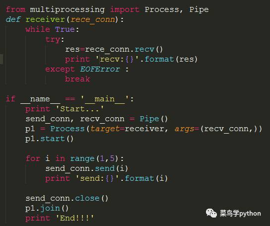 父进程负责发送数据,receiver子进程负责收数据,当父进程发送完毕之后,就会调用关闭管道,如果管道已经被关闭,那么子进程recv会抛出EOFError