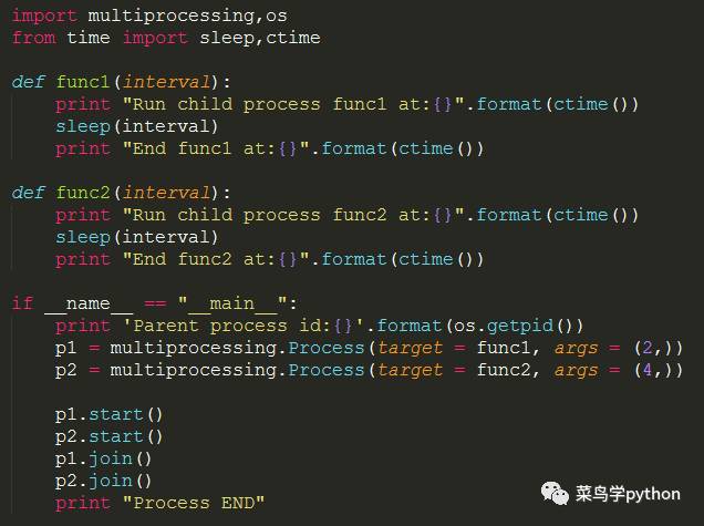下面我们来创建个多进程,也是用multiprocessing.Process来生成进程对象,生成两个进程,让两个进程同时工作,然后用join()阻塞,直至完成.