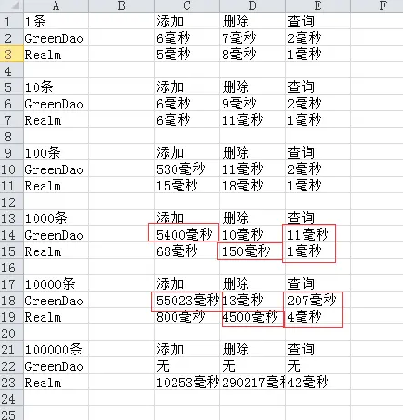 2、GreenDao和Realm性能对比(数据来源)