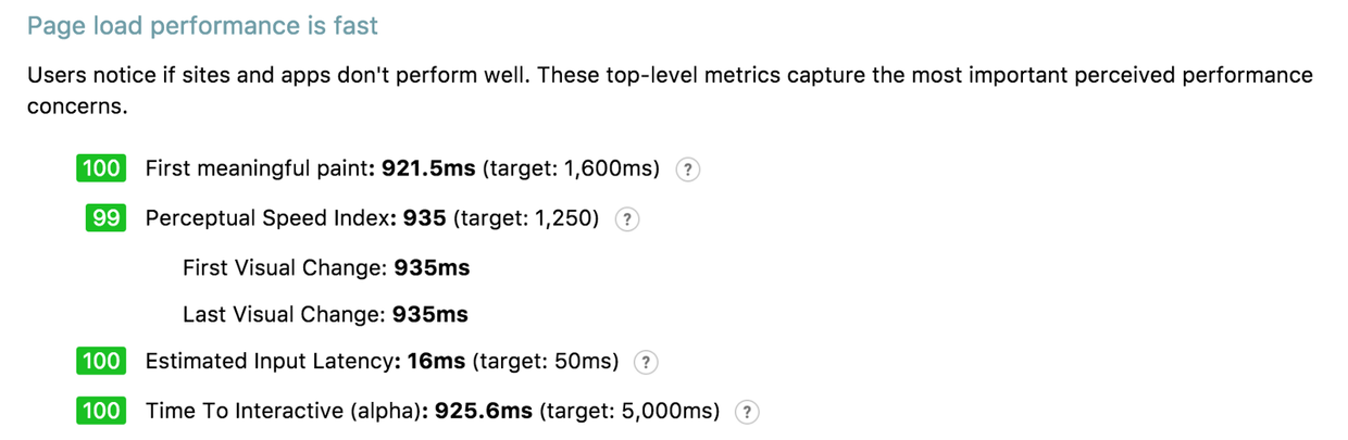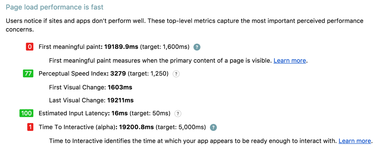 现在,我们有基本的产品形态了。目前面临的问题在于提高产品的各方面性能体验。我使用了Chrome Lighthouse去检验产品的性能表现。最终得到的结果为: