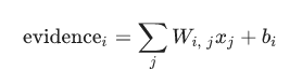 在训练的过程中,我们需要设定额外的偏置量(bias)以排除在输入中引入的干扰数据。下面图表示证据的提取计算公示,对于分类i给定一个x的输入得到: