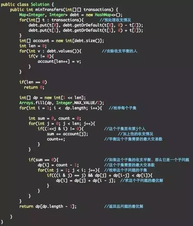 接下来我们分析这种解法的时间复杂度,假设去除所有收支平衡以后的人数为n,枚举子集的时间复杂度为O(2^n),对每个子集进行最优解分析也需要枚举它的所有子集(这些子集的最优解已经计算完成),需要的时间复杂度也为O(2^n),最终的时间复杂度为O(4^n)。空间复杂度为O(2^n)。