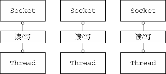 这段代码片段将只能同时处理一个连接,要管理多个并发客户端,需要为每个新的客户端Socket创建一个新的Thread,如图1-1所示。