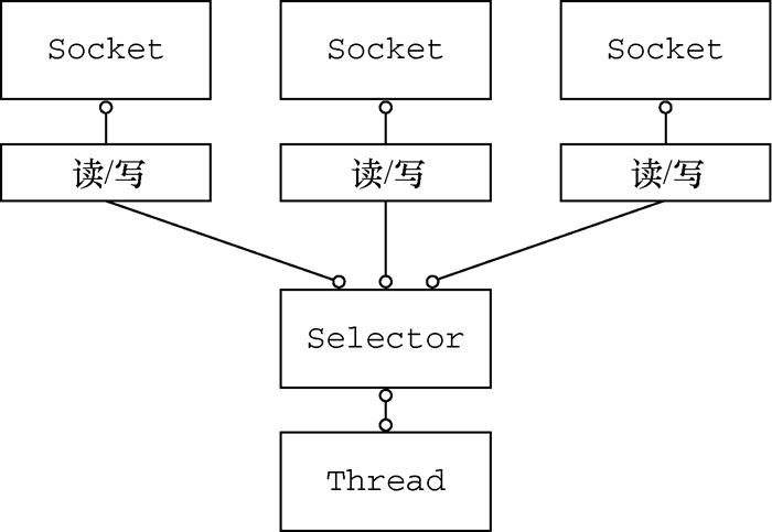 class java.nio.channels.Selector是Java的非阻塞I/O实现的关键。它使用了事件通知API以确定在一组非阻塞套接字中有哪些已经就绪能够进行I/O相关的操作。因为可以在任何的时间检查任意的读操作或者写操作的完成状态,所以如图1-2所示,一个单一的线程便可以处理多个并发的连接。