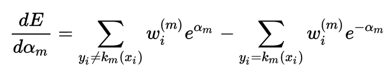 然后我们就得到了AdaBoost的损失函数,然后我们希望对其优化,最小化其函数值,这里我们让E对α求偏导: