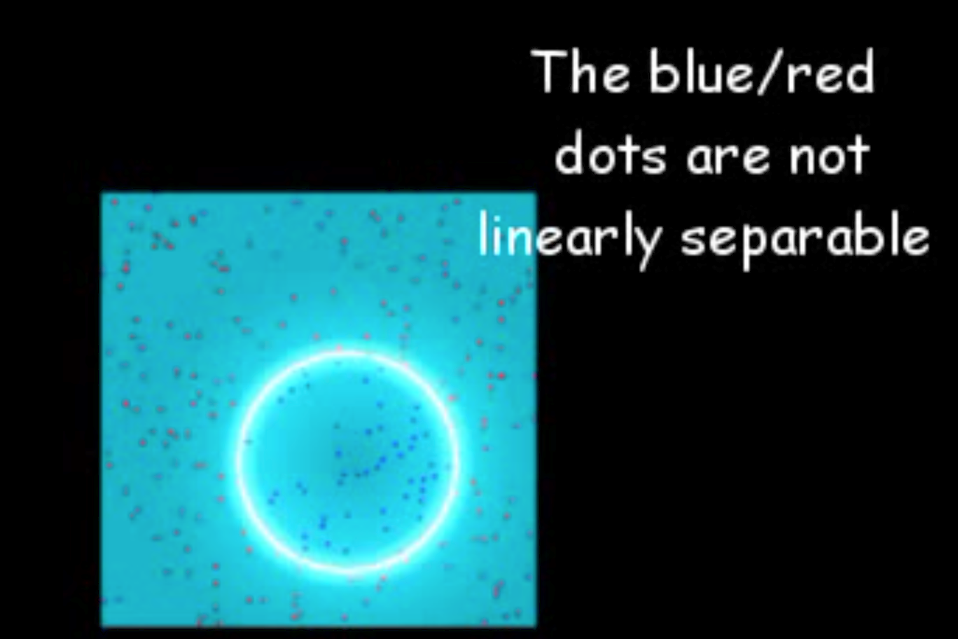 我们看到图中有个圈,我们姑且认为圈里面都是蓝点,圈外面都是红点,那我们怎么用一条直线(图是2维平面,则分隔超平面为1维直线)把红点和蓝点分开呢?