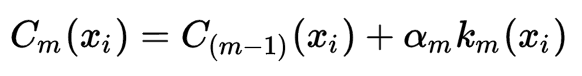 虽然这里的字母并没有全在前面出现过,但根据意思很容易理解,C是AdaBoost总分类器,m是迭代次数,x是样本、α是分类器权重、km是第m次迭代时所增加的那个分类器。