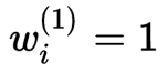 起始状态,所有样本的权重都是相同的,我们采用第一个弱分类器(我们对弱分类器的要求是只要二分类正确率高于50%就可以了,比瞎猜准一点就可以)对其进行分类,然后计算其分类加权错误率: