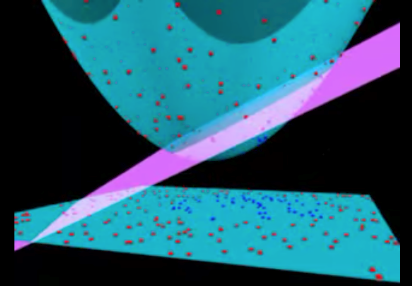我们啪的一下一拍桌子,这些红点蓝点全部都飞了起来,然后我们找准时机,一刀划出一个平面把两种点分开,2维线性不可分的数据成为了3维线性可分的数据,3维条件下分隔超平面为2维的平面。