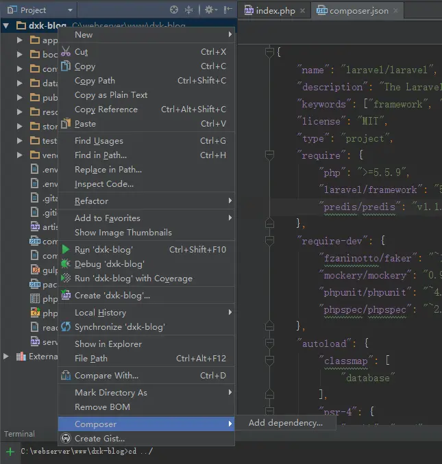 设置之后可以方便你在编辑器中安装和更新composer包,项目上右键composer>Add dependency如下图