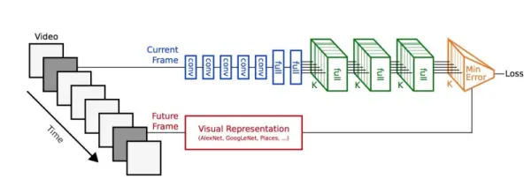 另一篇使用视频的文章出自 MIT 的 Vondrick 和 Torralba 等人([1504.08023] Anticipating Visual Representations from Unlabeled Video),有着非常惹人注目的结果。这项工作背后的思想是从视频输入中预测未来帧的表示。这是一种优雅的方法。使用的模型如下: