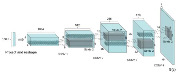 DCGAN 鉴别器被设计来判断一副输入图片是真实的(来源于某个数据集的真实图片)或虚假的(来源于某个生成器)。生成器将随机地噪声向量(例如 1024 个数值)作为输入,并生成一副图片。
