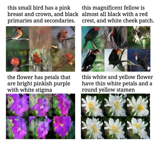 另一个非常有趣的例子如下,在例子中,作者用生成对抗训练去学习从文本描述中生成图像。参见论文《Generative Adversarial Text to Image Synthesis》,链接:[1605.05396] Generative Adversarial Text to Image Synthesis。