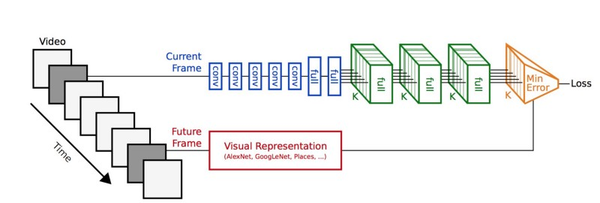 事实上,预测未来的帧是不必要的。我们愿意做的就是去预测下一帧的表征,就像 Carl Vondrick 做的一样。详见论文《Anticipating Visual Representations from Unlabeled Video》,链接:[1504.08023] Anticipating Visual Representations from Unlabeled Video。