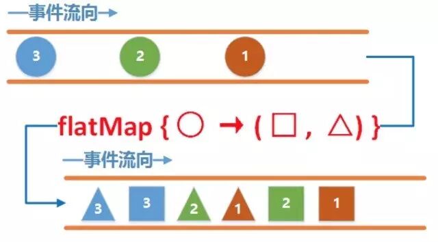 中间flatMap的作用是将圆形的事件转换为一个发送矩形事件和三角形事件的新的上游Observable.