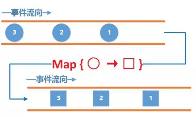 图中map中的函数作用是将圆形事件转换为矩形事件, 从而导致下游接收到的事件就变为了矩形.用代码来表示这个例子就是: