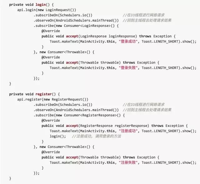 很明显, 这是一个嵌套的网络请求, 首先需要去请求注册, 待注册成功回调了再去请求登录的接口.