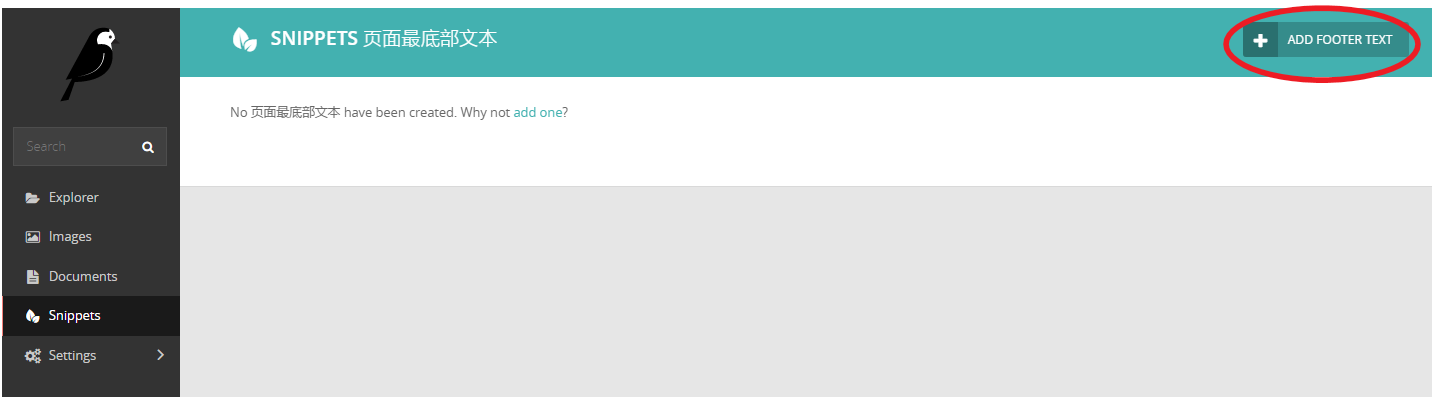 - 不过细心的朋友可能会发现页脚还是空的,我们还需要在管理界面设置下页脚,点击snippets栏,并点击红圈