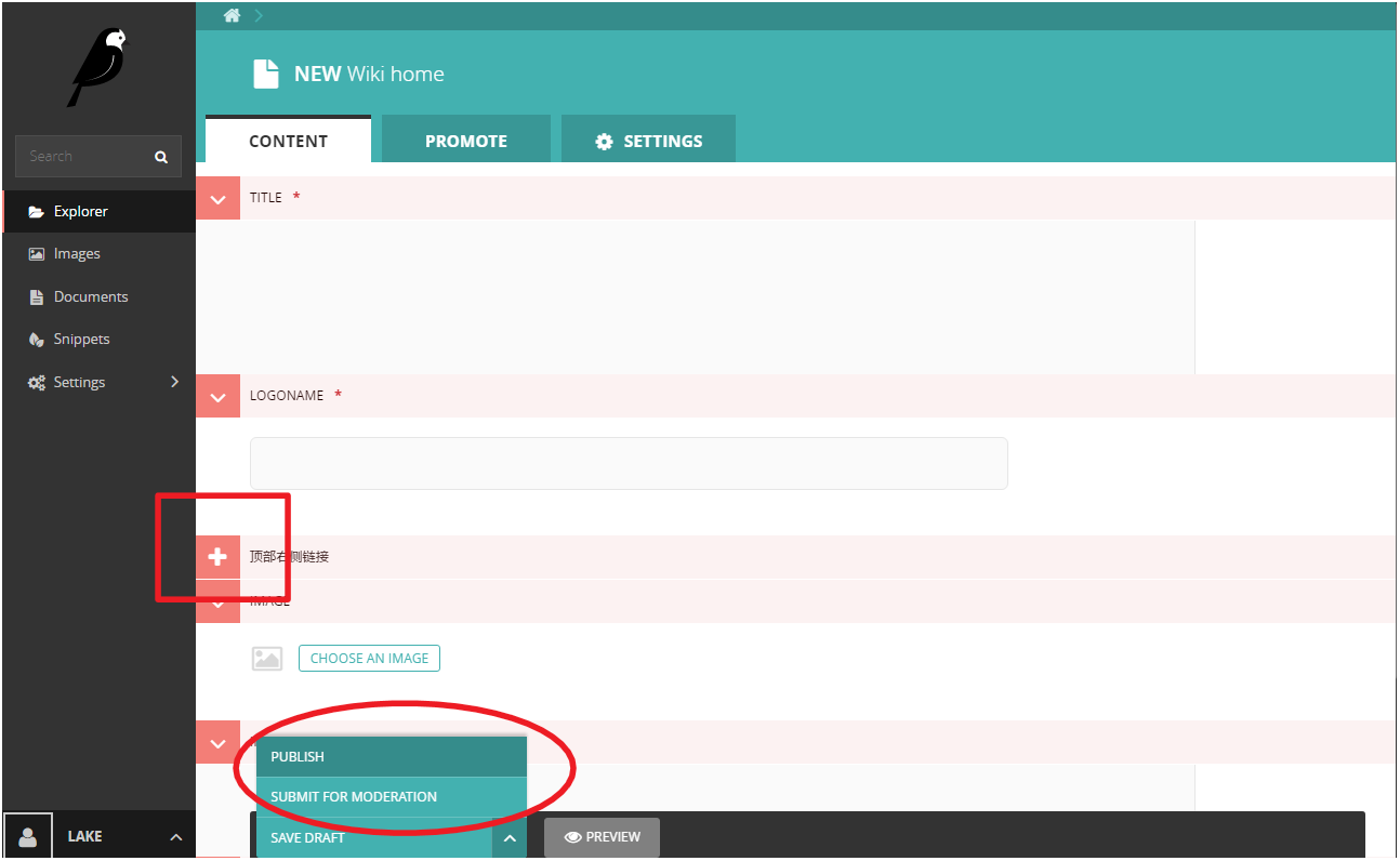 这时便来到我们的创建的WikiHome模型的页面元素填写界面,依次填写后按红圈处Publish提交。