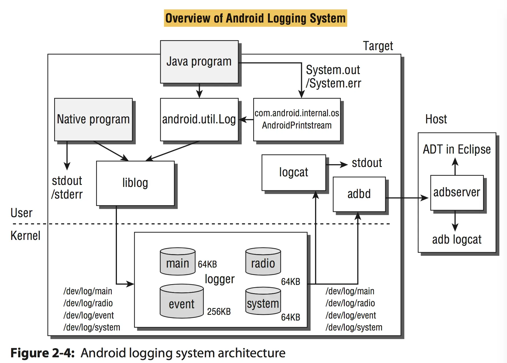 Android kernel仍然使用基于Linux的kelnel-logging机制,同事它也使用另外被称为logger的子系统。logger通过logcat命令,用于查看日志信息,其中包括四种类型:main,radio,event和sustem。