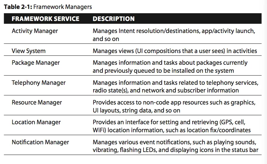 除此之外,Framework还通过各种manager来管理服务,而下表列出的manager都是由system_server启动。