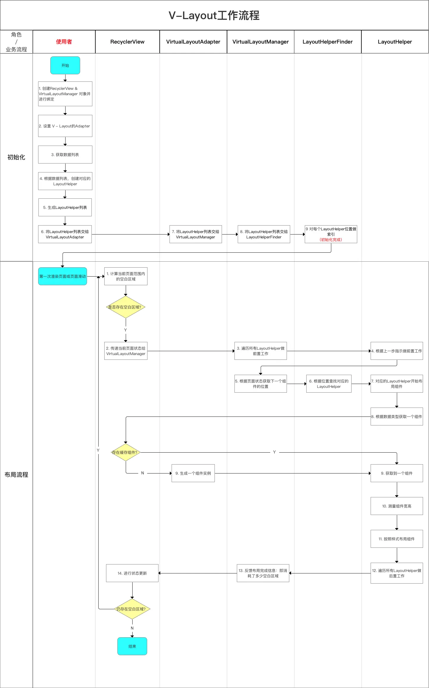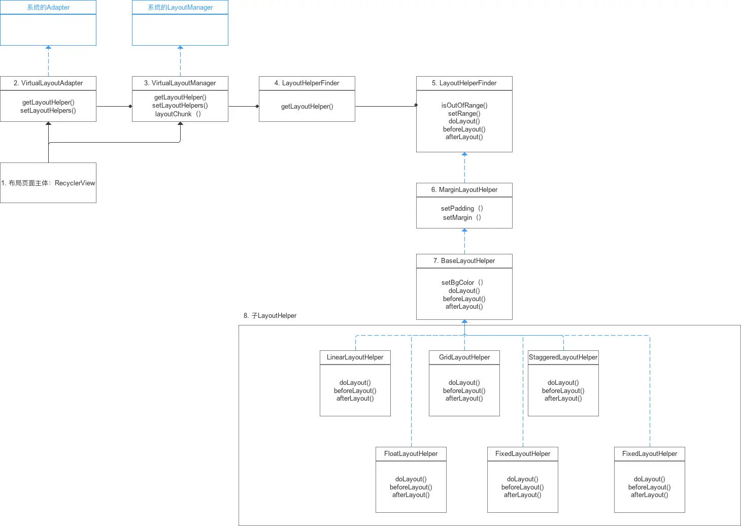 V - Layout的本质原理是:通过自定义一个VirtualLayoutManager(继承自 LayoutManager),用于管理一系列LayoutHelper,将具体的布局能力交给LayoutHelper来完成,从而 快速实现组合布局 的需求。