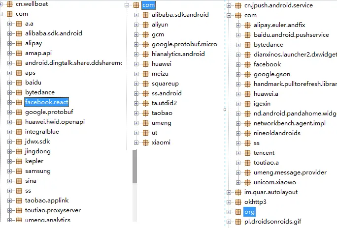 有图可知共使用的服务有andfix、百度推送、极光推送、gson(我觉得fastjson更好用)、小米推送、华为推送、个信、autolay自动布局、友盟等等。