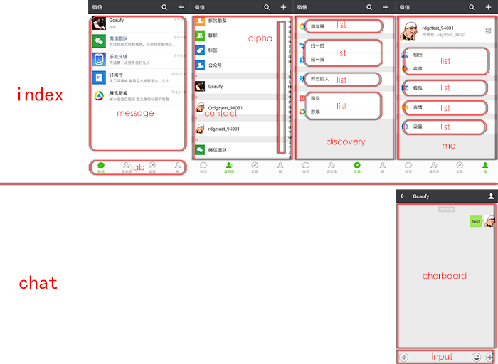 首页index中包含一个tab组件和四个tab分别所对应的组件message,contact,discovery,me。而且各自还包含一些子组件,如contact组件中包含alpha字母列表组件,discovery和me组件中分别包含一些list菜单列表组件。其中list组件达到了很好的复用效果。