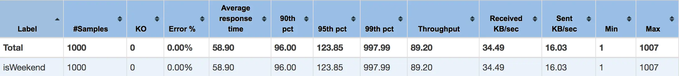 总共有1000次请求,平均响应时间是58.9ms,TP95是123.85ms(平均响应时间的2.1倍),TP99是997.99ms(平均响应时间的16.9倍)。假设应用设计的最大响应时间是100ms,单看平均时间是完全符合要求的,但实际上已经有超过50个请求失败了。如果看TP95或者TP99,问题就很清楚了。