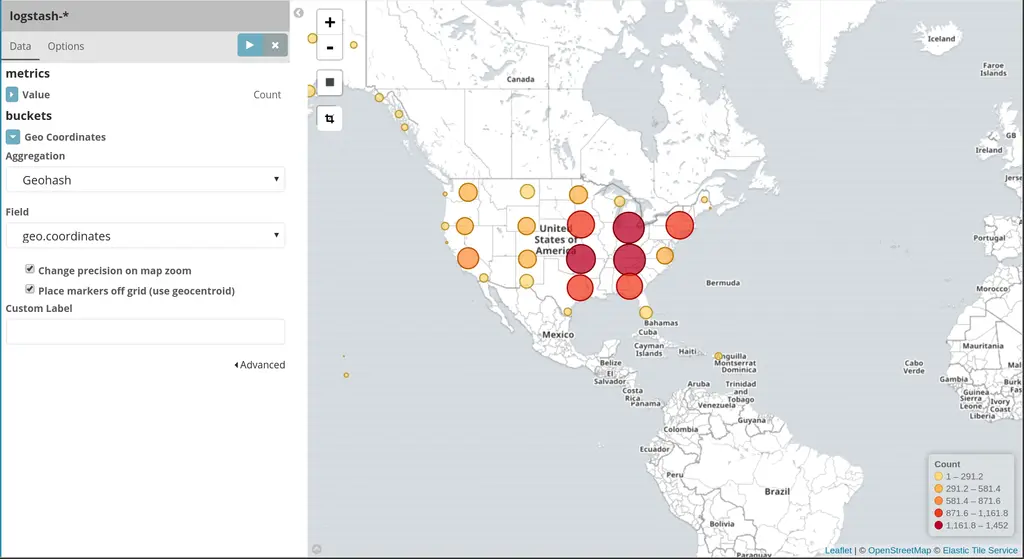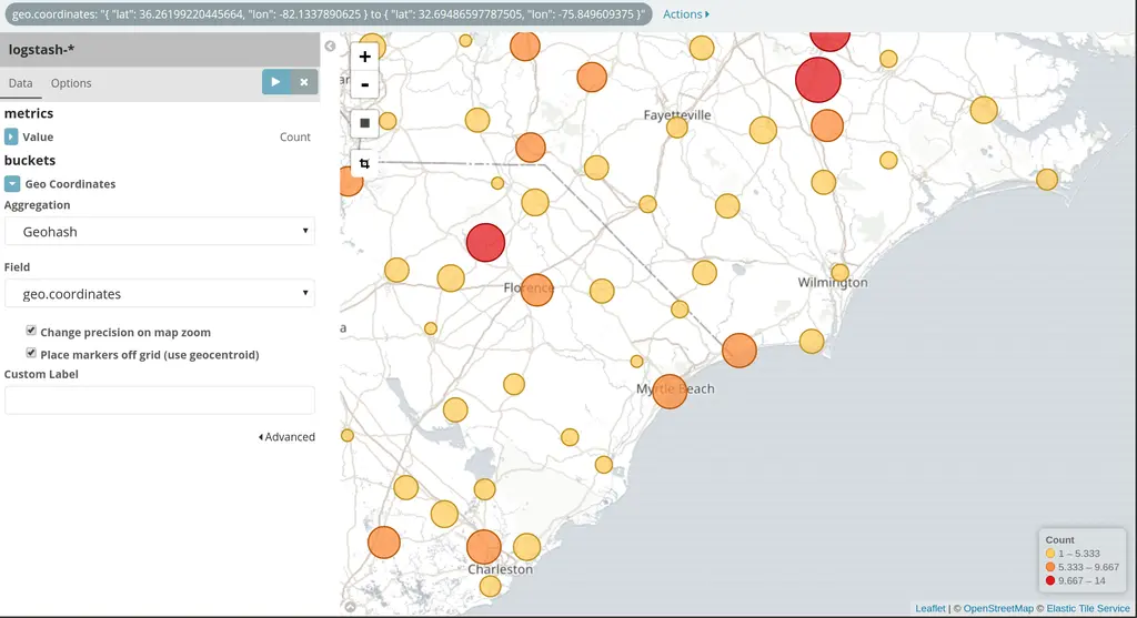 Geohash聚合类型,点击Apply changes执行分析即可看到如下信息