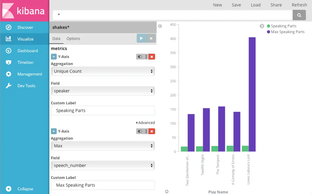 shakes*索引模式。 - 为在Y轴显示每部戏中演讲者的数量,需要配置Y轴方向的度量值。选择