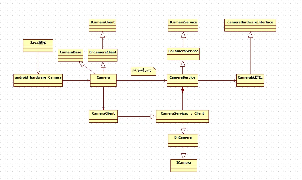 - Camera交互对象,从开始连接过程中式Camera与CameraService,连接之后基本上就是Camera与CameraClient进行交互,这里注意到CameraClient是继承CameraService::Client的,而后者则是继承BnCamera,继承ICamera,Camera类中存在一个ICamera变量,就是这个内容;