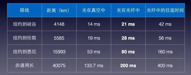 数据在网络上传输,从一个节点经过多级服务器转发到达另一个节点,是不可避免有物理延时的,下面这个表格给出了理论上数据在光纤中的网络传输的时间(实际场景中的延时往往比这个要大很多,因为涉及到带宽、网络抖动等干扰):