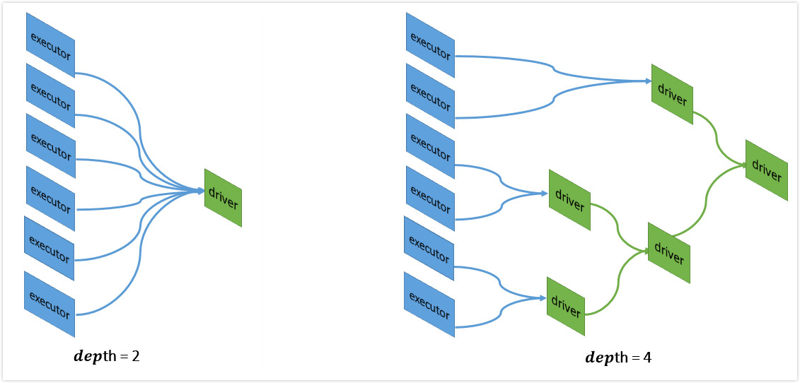 根据前面的描述,每一个用户的数据构成一个RBM子网络,集群首先是对数据和子模型进行切分,模型和数据在运行的过程中将被分配到不同的executor中执行,得到每一个子模型的正梯度以及k步Gibbs采样后的负梯度,然后子结果传送回driver端进行合并,一般来说为了防止全部数据返回造成driver端的网络通讯压力以及内存压力,我们可以采用树聚合的方式来优化,下图是树深度为2和树深度为4的效果图,注意不同线条的颜色代表数据在不同的单元中传输,从图中可以看出,深度越大,计算的步骤会变长,但每一次传输到driver的数据会减少,可以防止driver端内存溢出的问题。