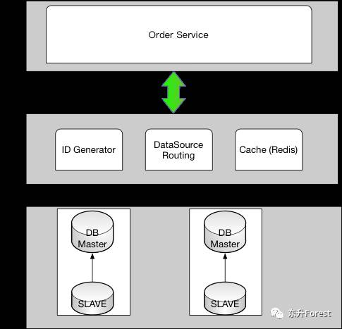 再延伸往下讲两句,一般来说,垂直分库基本就够了,但是作为ToC项目,表里的数据会越积越多,而且是非线性增长的,性能某一个时刻是要大幅下滑的,所以还需要再做一层。系统将会如下图来改变: