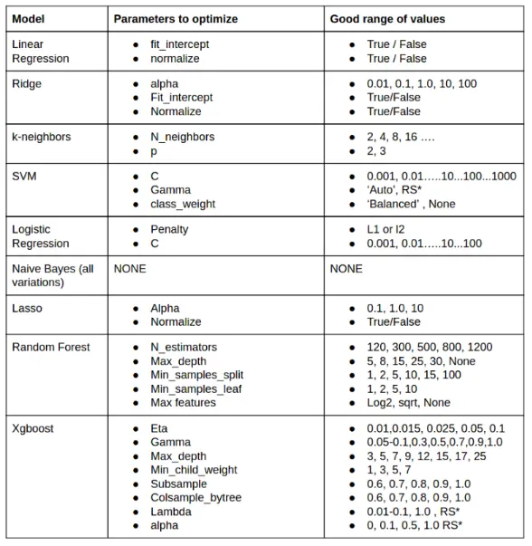 虽然在sklearn的文档里,会列出所有算法所带有的参数,但是里面并不会说调节哪个会有效。在一些mooc课程里,有一些项目的代码,里面可以看到一些算法应用时,他们重点调节的参数,但是有的也不会说清楚为什么不调节别的。这里作者根据他100多次比赛的经验,列出了这个表,我觉得可以借鉴一下,当然,如果有时间的话,去对照文档里的参数列表,再查一下算法的原理,通过理论也是可以判断出来哪个参数影响比较大的。