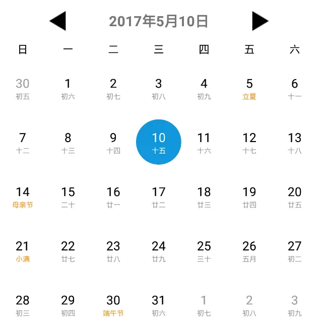 public Object instantiateItem(ViewGroup container, int position) { MonthView view = new MonthView(container.getContext()); //根据position计算对应年、月 int[] date = CalendarUtil.positionToDate(position, dateStart[0], dateStart[1]); view.setDateList(CalendarUtil.getMonthDate(date[0], date[1]), SolarUtil.getMonthDays(date[0], date[1])); container.addView(view); return view; }这里只保留了核心的代码,当日历切换月份时,会自动根据position计算出对应月份的日期数据,然后传给MonthView,最后将MonthView添加到ViewPager中。