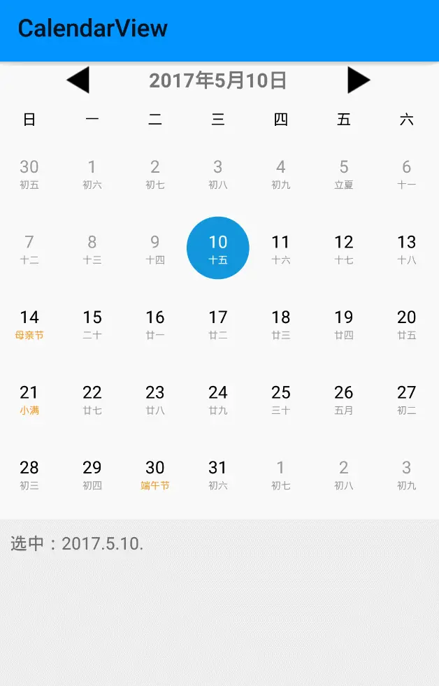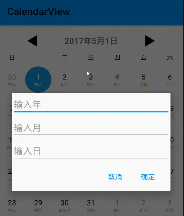 setCurrentItem(int item, boolean smoothScroll)方法,这样就能跳转到position对应的MonthView,然后结合第六点的方法选中对应的日期View。这样跳转到日历设定日期范围内的任意一天都是没问题的。十、自定义日历样式