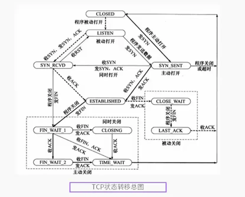 以ESTABLISHED为界限,上部分为建立连接的过程,下部分为断开连接的过程