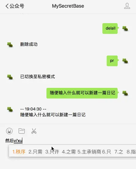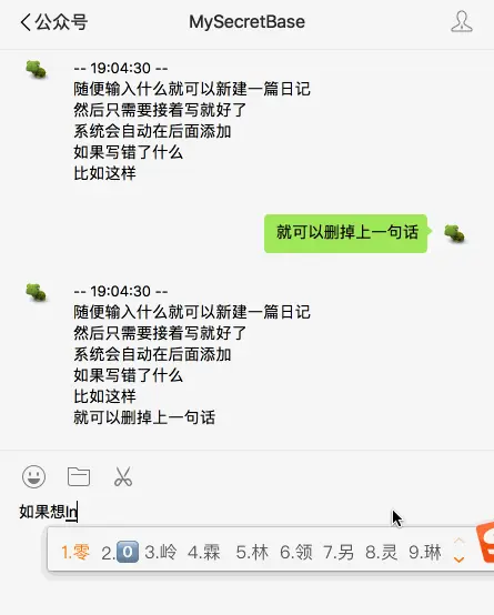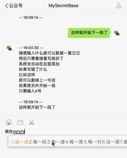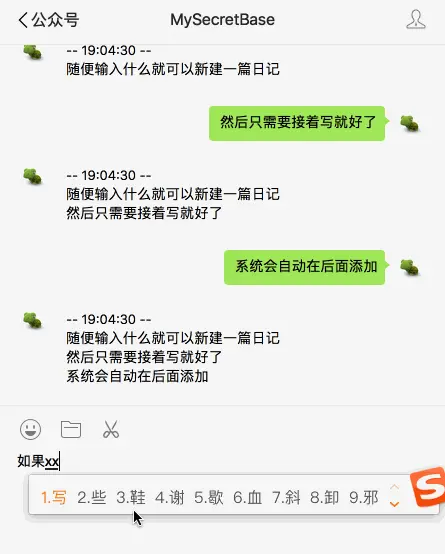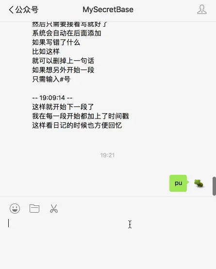 因此我就有了用微信公众号来记日记的想法,我心里有什么想法,或者有什么想记录下来的,只要打开微信这个我们生活中最最常用的软件, 在聊天框里打一两句话就记下来了,是不是很方便呢。