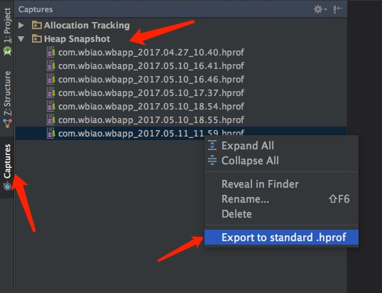 当我们集成了MAT工具后,我们回到AS IDE中,之前我们在分析Monitor Memory时候生成过.hprof文件,这时需要通过AS转换一下格式或者使用jdk自带命令转换,如下图AS转换: