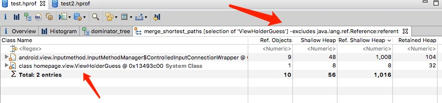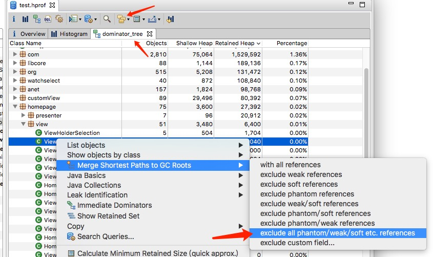 意思是查看排除虚引用/弱引用/软引用等的引用链,因为被虚引用/弱引用/软引用的对象可以直接被GC给回收,我们要看的就是某个对象否还存在Strong 引用链(在导出HeapDump之前要手动出发GC来保证),如果有,则说明存在内存泄漏,然后再去排查具体引用。(记得看最上方的箭头,用包名来查看)