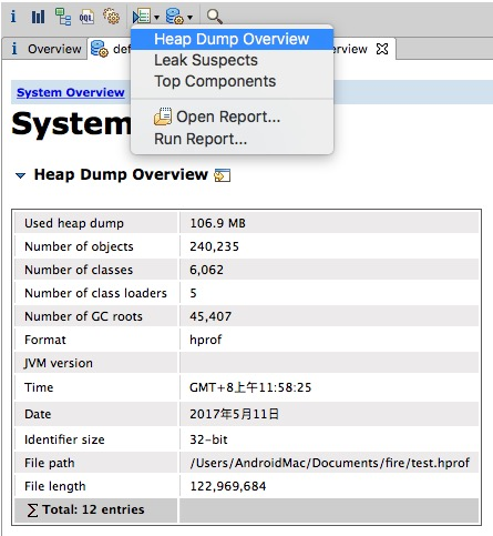 接着我们用MAT打开转换后的.hprof文件.如下图所示,我们要关注红框内的功能.